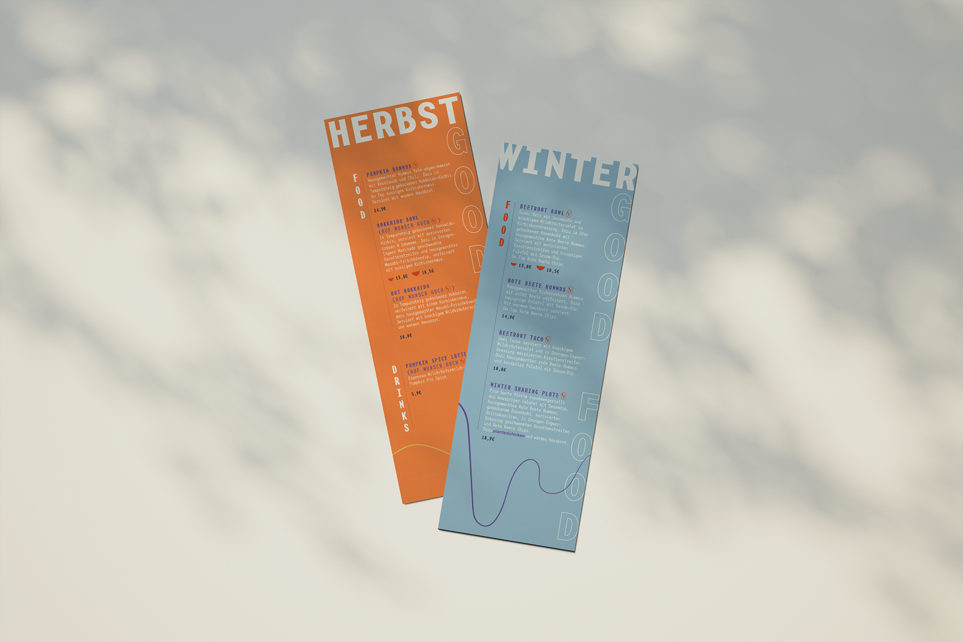 I have been doing the graphics for the ‘Good Food’ restaurant for several years. In addition to a small branding, I have already revised the menu several times, designed seasonal menus and created stickers, stamp cards and flyers.
