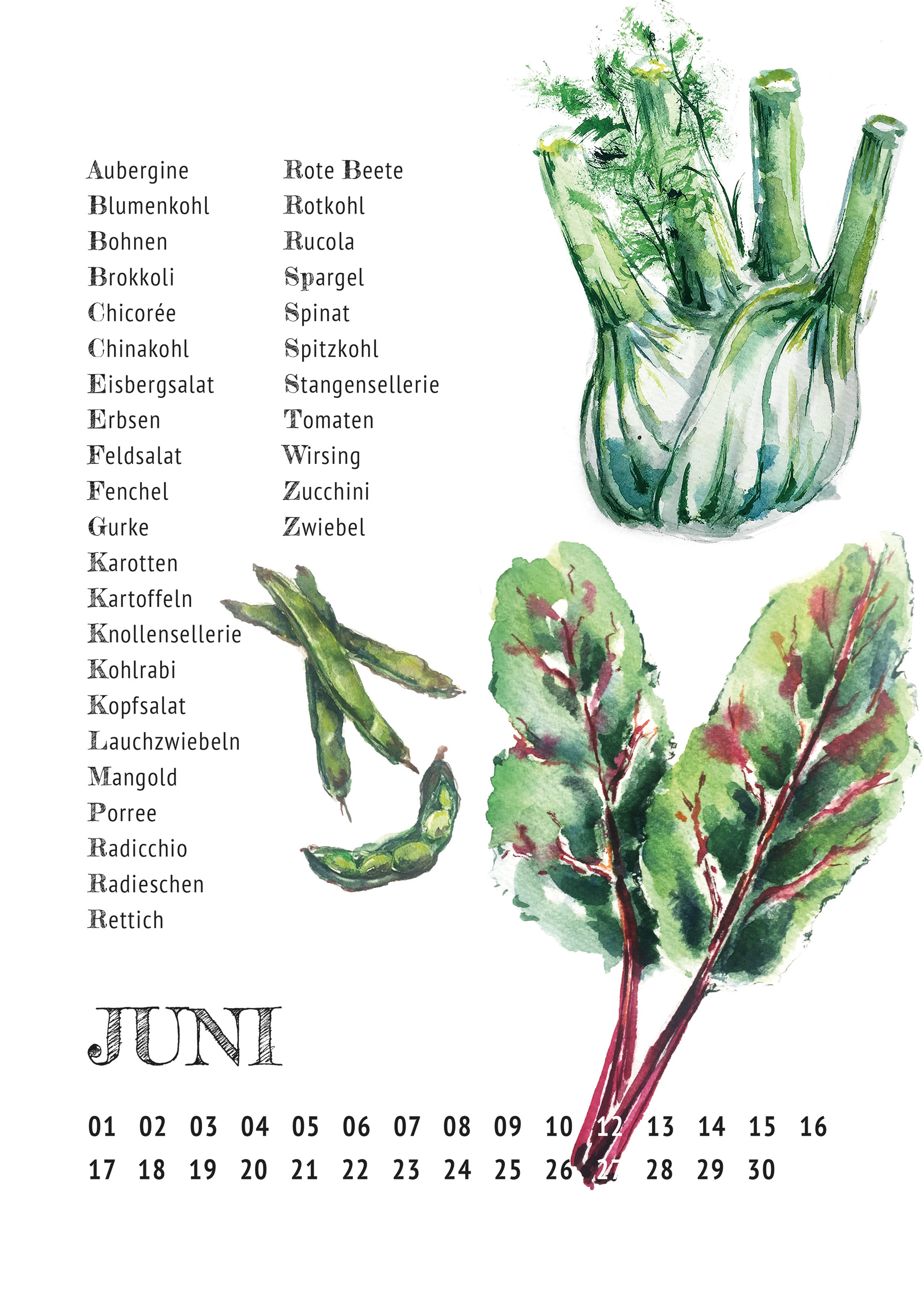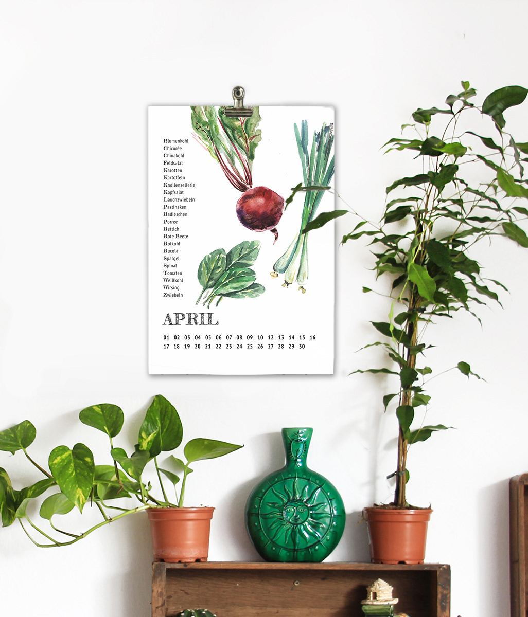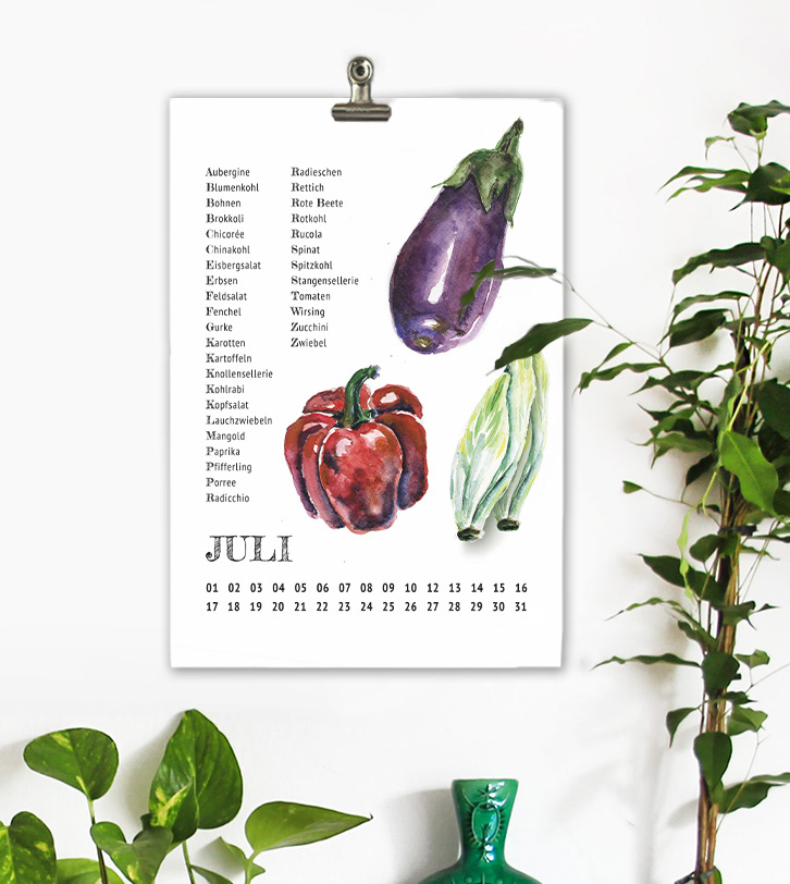 A watercolour illustrated calendar with seasonal and regional veggies.