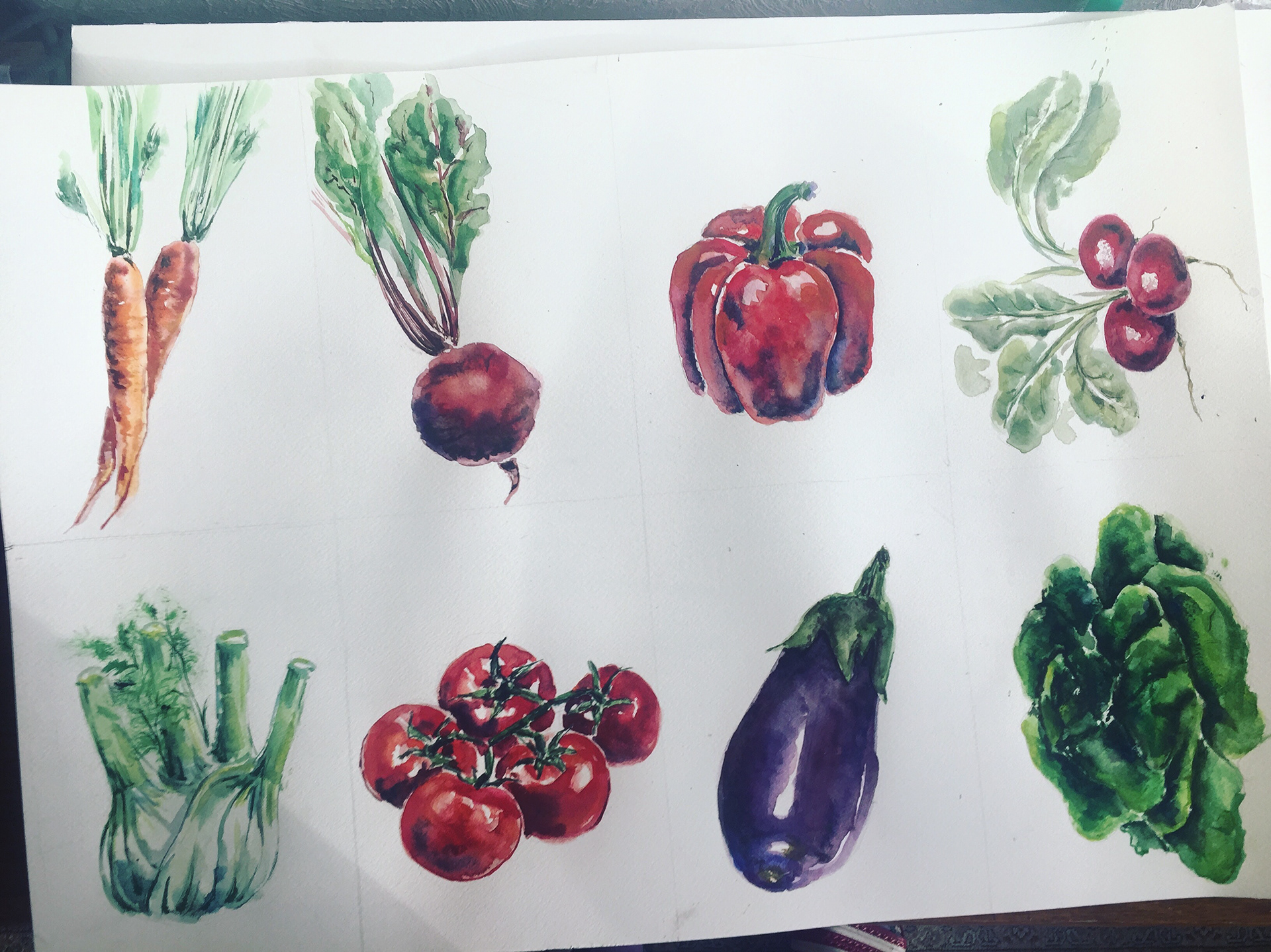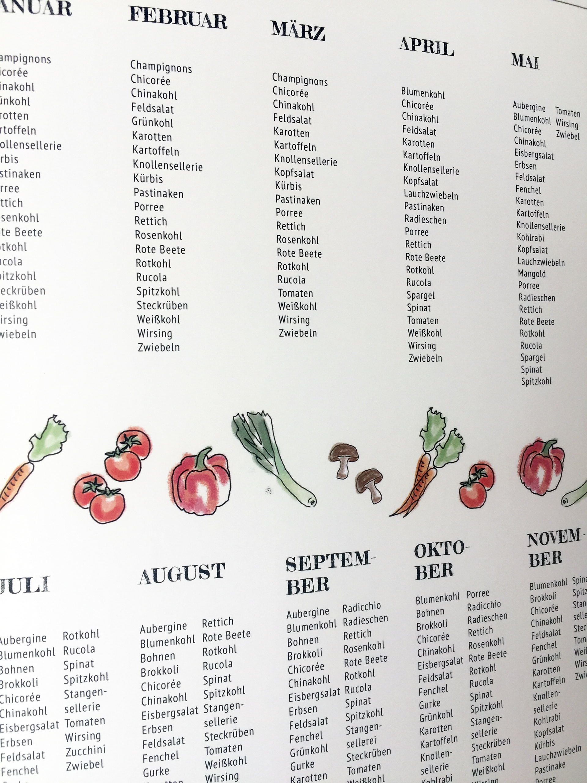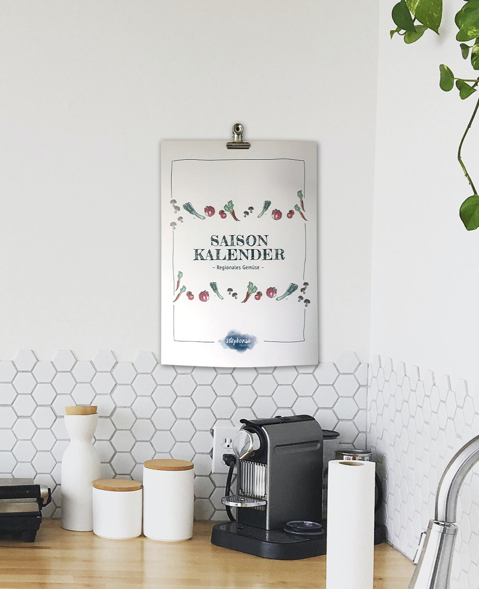 A watercolour illustrated calendar with seasonal and regional veggies.